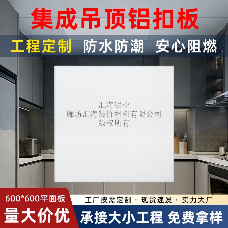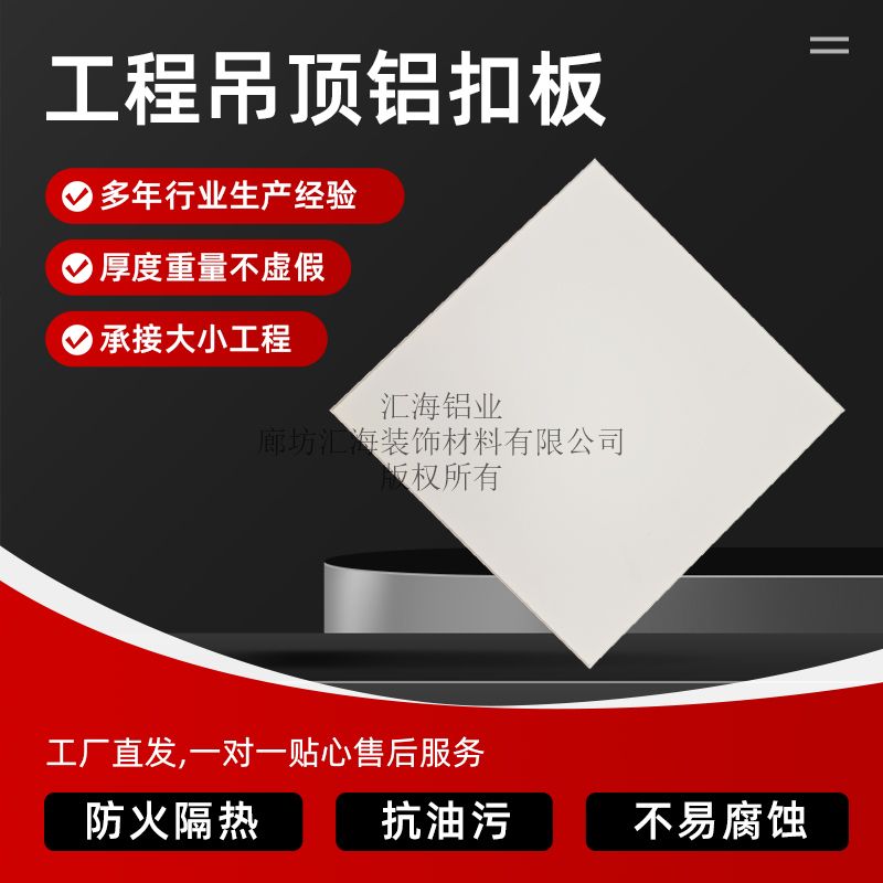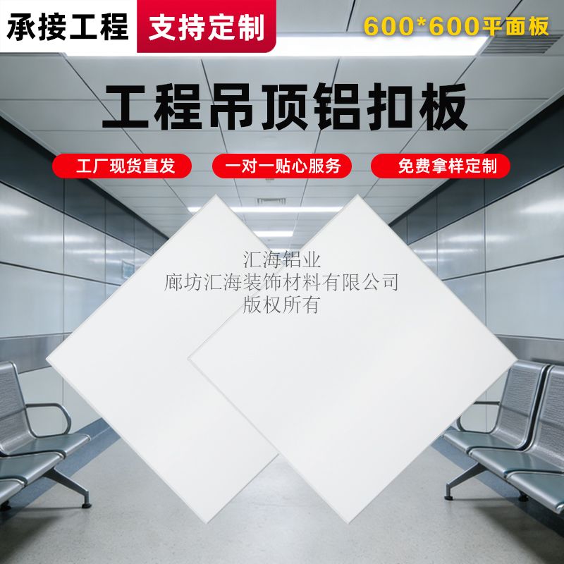 汇海铝业 600×600mm 平面铝扣板是室内工装常用吊顶材料。基材选用纯铝,厚度可选0.5-2.0mm按需选择,符合铝合金板带材通用标准。