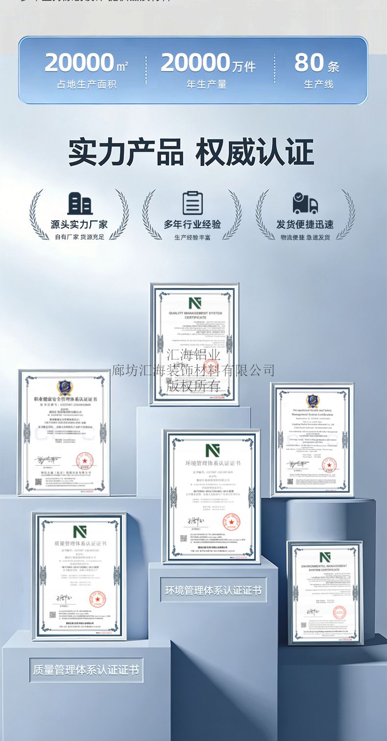 廊坊汇海装饰材料有限公司(汇海铝业)是一家专业从事工程吊顶材料研发、生产与销售的企业,核心产品涵盖铝扣板、铝方通、铝方管、铝格栅四大系列,覆盖常规工程吊顶全品类需求。