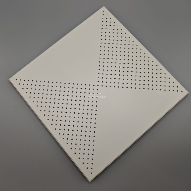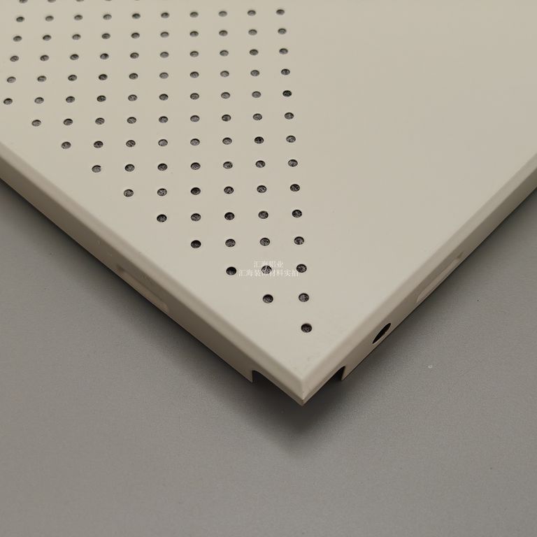 基材选用纯铝,厚度可选0.5-2.0mm,符合铝合金板带材通用标准。采用高精度数控冲压技术,孔位沿板材对角线对称分布,孔径与孔距按工程标准设计,孔洞均匀规整,定位精度高。板材经整平、裁切、模压成型,边缘无毛刺,折边尺寸适配标准三角龙骨,支持暗架式安装。